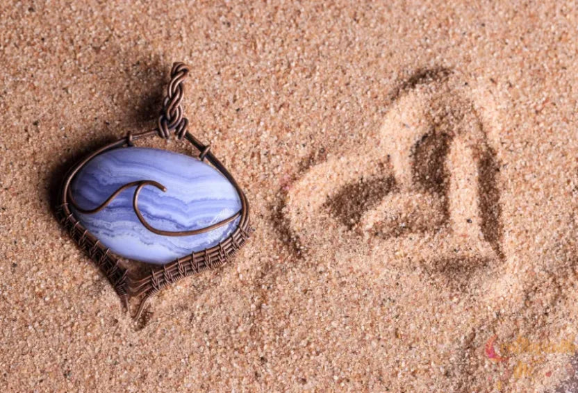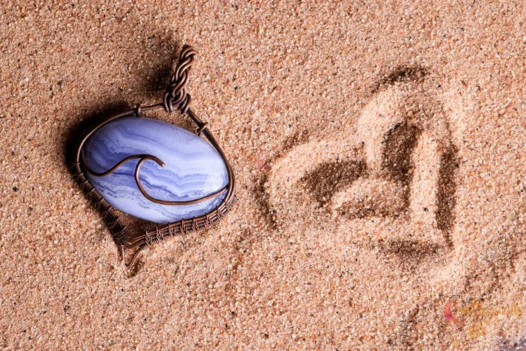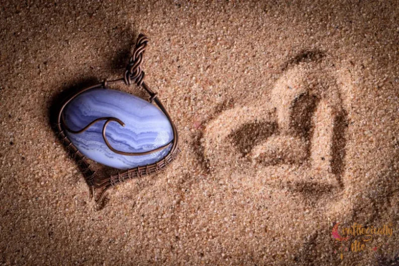 The Blue Lace Agate Sea Wave Pendant captures the soothing essence of the sea with its natural sky-blue gemstone wrapped in an elegant wave-inspired design. Handcrafted in oxidized copper wire, this pendant combines earthy tones with serene blues, reflecting balance, peace, and clarity. Each piece is uniquely crafted to highlight the gemstone’s delicate lace-like bands.