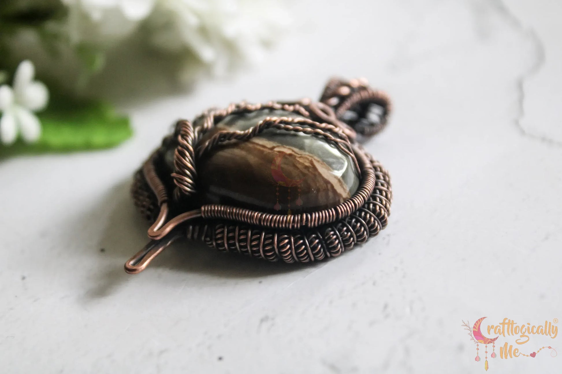 - Handmade wire-wrapped pendant featuring natural Picture Jasper gemstone